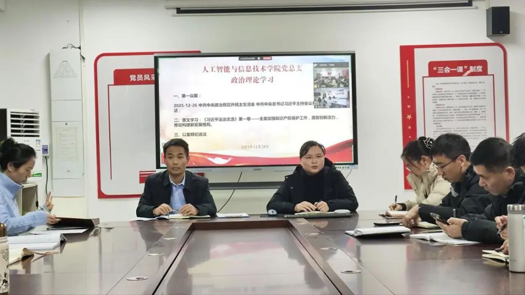 2025年12月30日,william威廉中文官网党总支组织郑州校区和开封校区全体党员及教职工,开展政治理论学习活动。本次学习活动由william威廉中文官网书记崔琳主持。主要学习内容有:一、第一议题:2025-12-26 中共中央政治局召开民主生活会中共中央总书记习近平主持会议并发表重要讲话;二、原文学习:《习近平法治文选》第一卷——全面加强知识产权保护工作,激发创新活力,推动构建新发展格局;三、以案释纪说法。