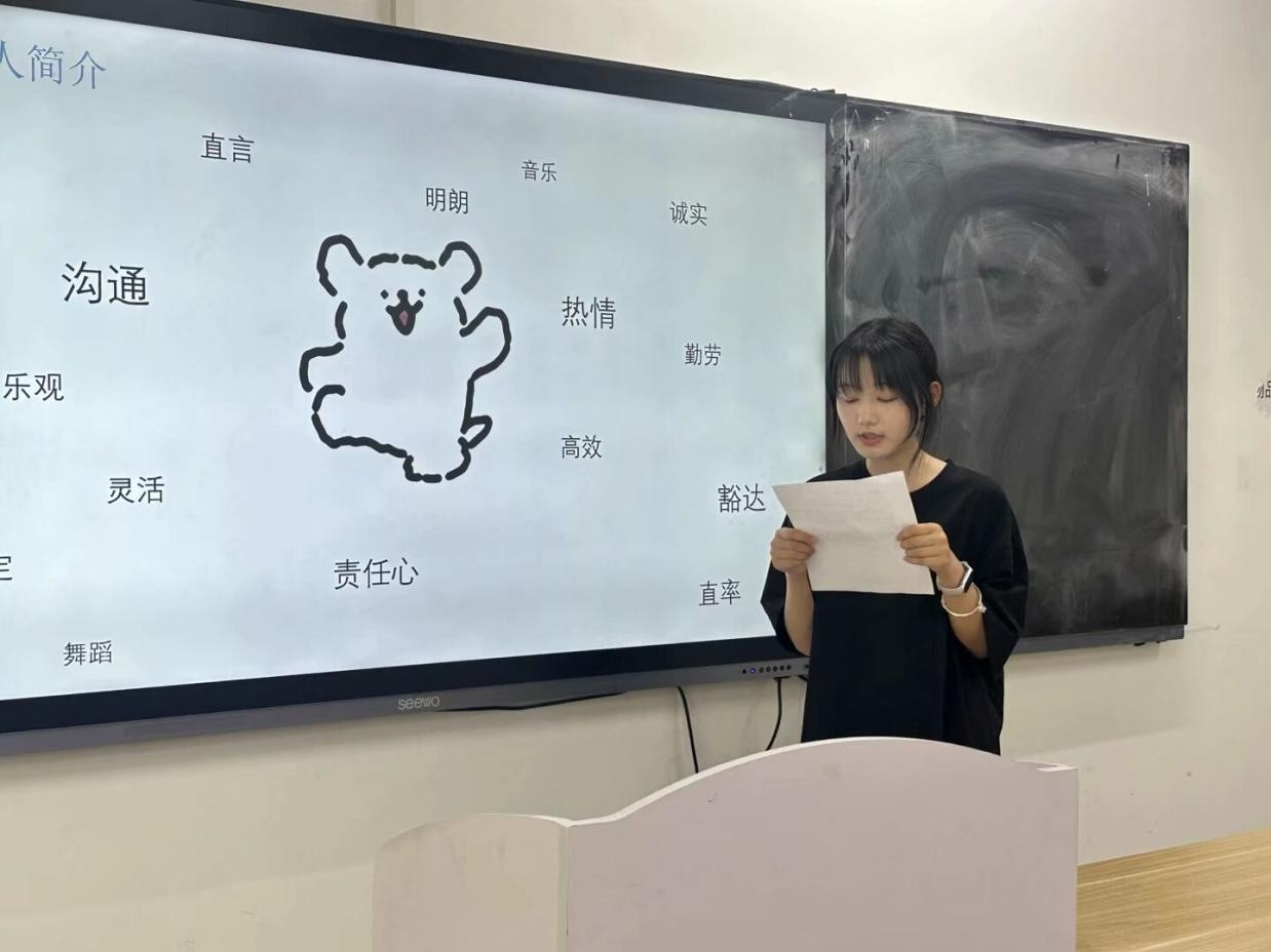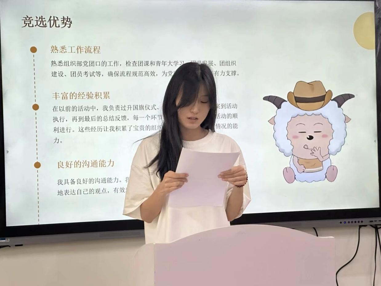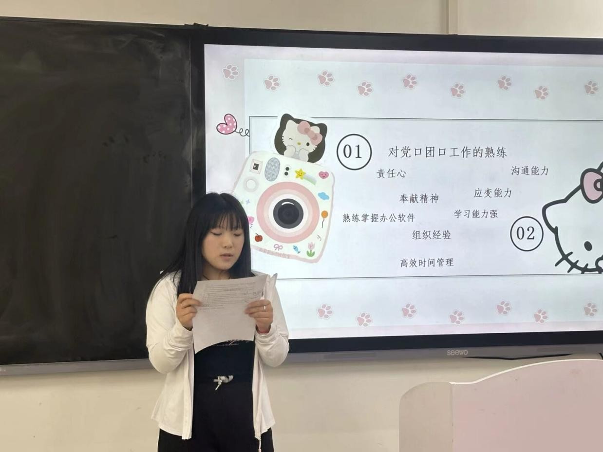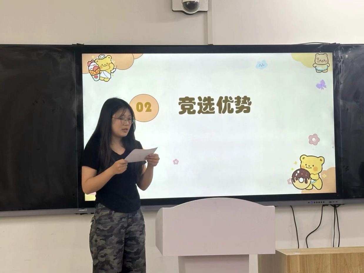 随后,参与竞选的同学们依次上台发表竞选演讲。她们自信满满,结合自身优势,阐述了对竞选岗位的理解和工作规划,表达了为公司和同学们服务的决心。