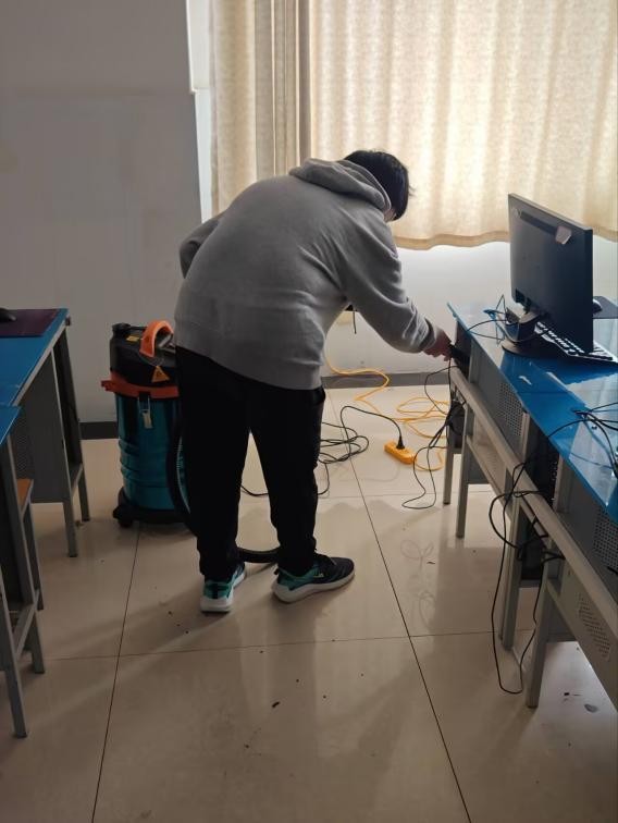活动当日,在机房管理老师的悉心指导下,同学们迅速行动,明确分工。小心翼翼清理机箱,确保设备的顺畅运行;认真仔细扫拖地面、擦桌子、玻璃,铲除顽固的胶渍等,力求尽善尽美,在整个清扫过程中,同学们毫无怨言,不怕脏、不怕累,干劲十足,以饱满的热情为营造良好的考试环境贡献着自己的力量。